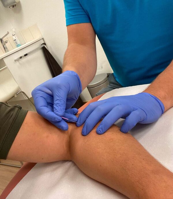 Behandeling: de fysiotherapeut prikt met een dunne naald precies in het triggerpoint. Dit zorgt ervoor dat de spier kort aanspant en daarna ontspant. Het naaldje wordt na de behandeling weer weggehaald. Het blijft niet zitten zoals bij acupunctuur.