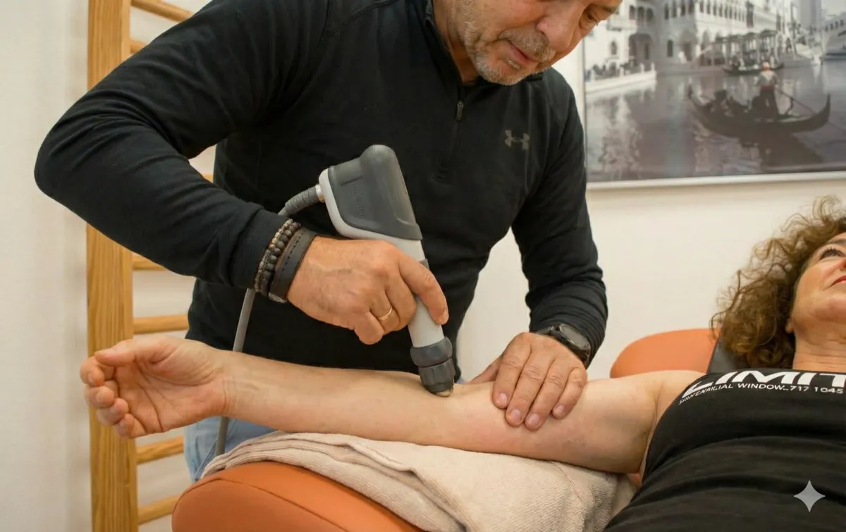 Shockwave therapie is een moderne behandeling waarbij geluidsgolven worden gebruikt om chronische pijn en hardnekkige blessures te behandelen. Het apparaat stuurt korte, krachtige geluidsgolven door je huid naar de pijnlijke plek.